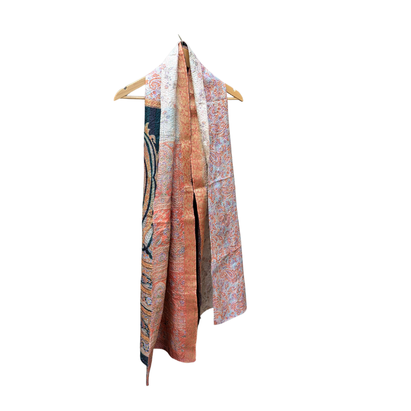 - Artful Stitching: Adorned with beautiful kantha embroidery by low-income women in West Bengal, a centuries-old technique involving delicate, hand-stitched running stitches that add both texture and durability. It takes 15 to 30 days to create a silk sari kantha shawl.