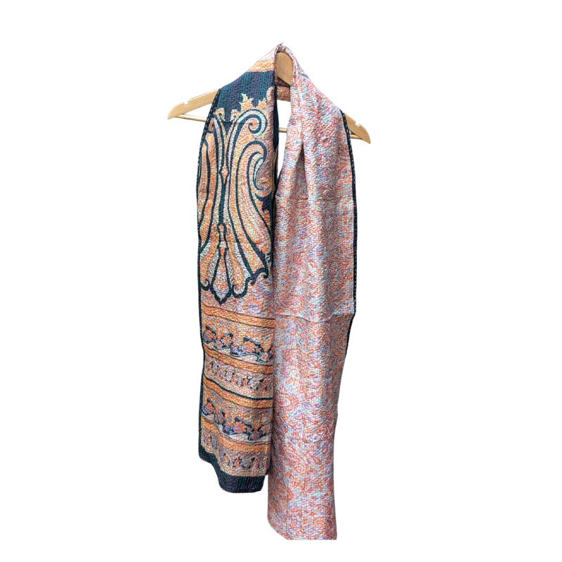 Style this reversible upcycled kantha silk sari shawl in orange, black, peaches and cream 4 ways! Get three (or four?) different outfits with one shawl!